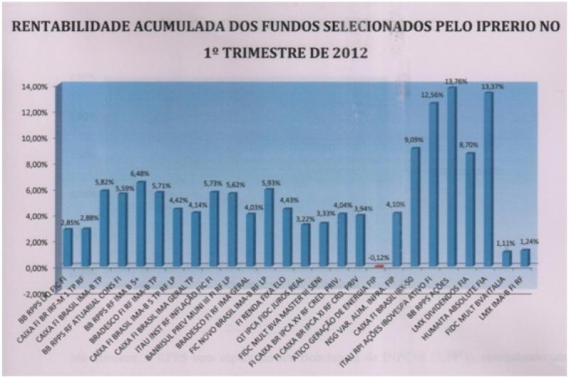 Hoje o IPRERIO conta com o montante de mais R$ 51.000.000,00(Cinqüenta e milhões de reais) para o pagamento das aposentadorias e pensões de todos os servidores municipais e suas autarquias, quando assumimos passava um pouco de R$ 10 milhões. Tivemos bons desempenhos na administração destes recursos, fizemos vários cursos dentre eles sou certificada com a CPA 10 a qual hoje por Lei do Ministério da Previdência somente servidores efetivos e certificados poderão cuidar de nossos recursos. Não é muito fácil mais acho louvável esta exigência pois qualquer servidor ao assumir um cargo desta magnitude tenha o mínimo de conhecimento de mercado financeiro. Em breve por conta de uma nova Portaria do MPAS nº 170 de 25 de abril de 2012 estaremos credenciando todos os Bancos onde o IPRERIO tem seus recursos aplicados e também criando um Comitê de Investimento que juntamente com a Diretora Executiva vai poder analisar e conhecer o mecanismo de cada instituição Financeira, hoje temos a Política de Investimento, a qual todo final de ano nos reunimos com o Conselho Administrativo para definirmos onde serão alocados os recursos do IPRERIO, durante o ano seguinte, sempre seguindo a tendência do Mercado Financeiro, que hoje se encontra bastante turbulento. Mais fizemos varias diversificações dos recursos do IPRERIO aplicando em Vários fundos de Investimentos com varias modalidades de Fundos de Acordo com a RESOLUÇÃO 3922 DA CVM, onde os servidores poderão acompanhar nos gráficos e na tabela.